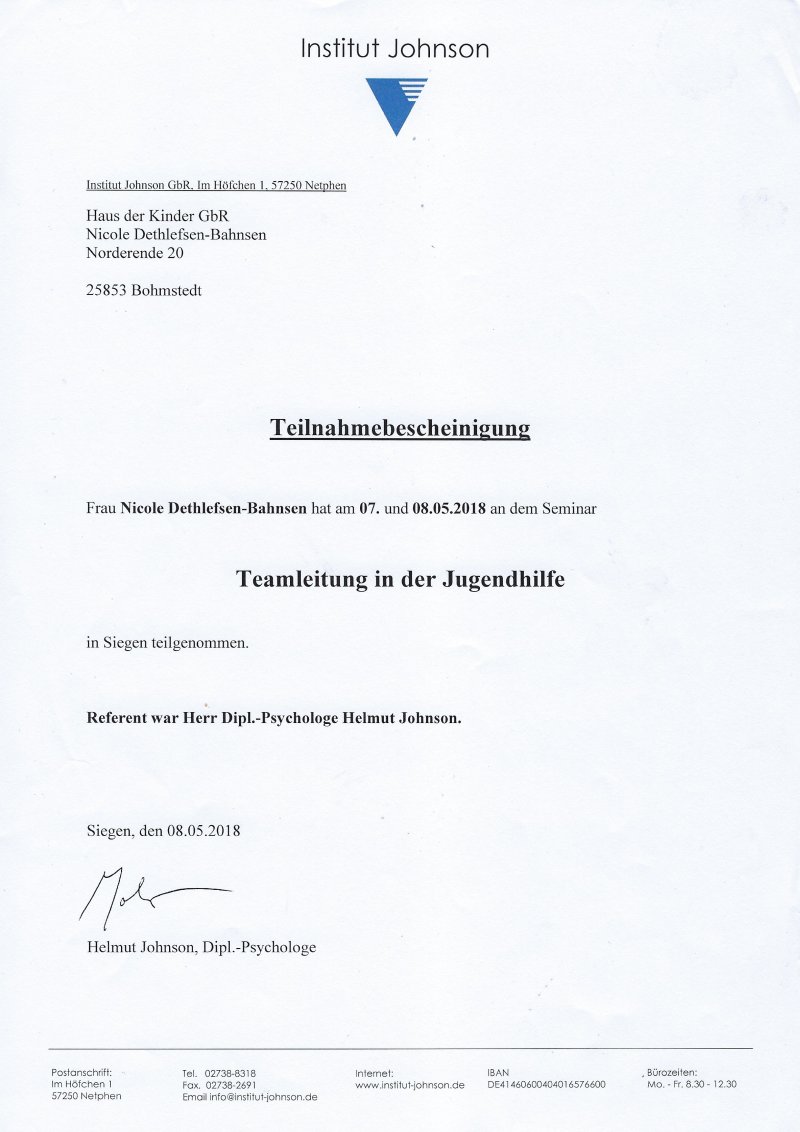 Die Heimleterin Nicole Dethlefsen-Bahnsen hat sich zwei Tage in einem Intensivseminar in Siegen fortgebildet im Feld der Teamleitung in der Jugendhilfe, um die Qualität der angebotenen Leistungen ständig zu verbessern. Spezielle Teams für einzelne Ressorts und Aufgaben innerhalb des Heimes werden jetzt unter ihrer Führung gebildet und Verantwortlichkeiten genau definert.